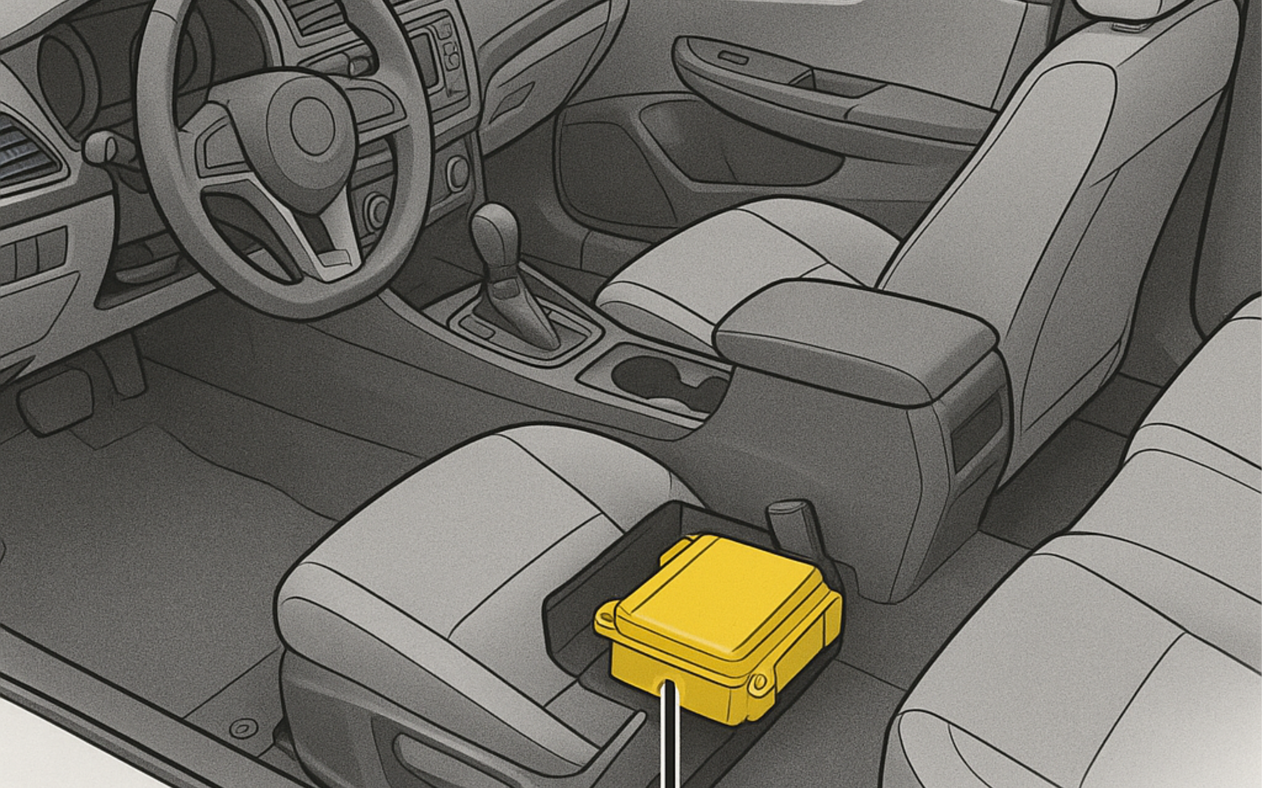 The Airbag Module (SRS Control Module) is usually mounted under the center console on the vehicle floor, and in some models it may sit beneath the radio deck.
